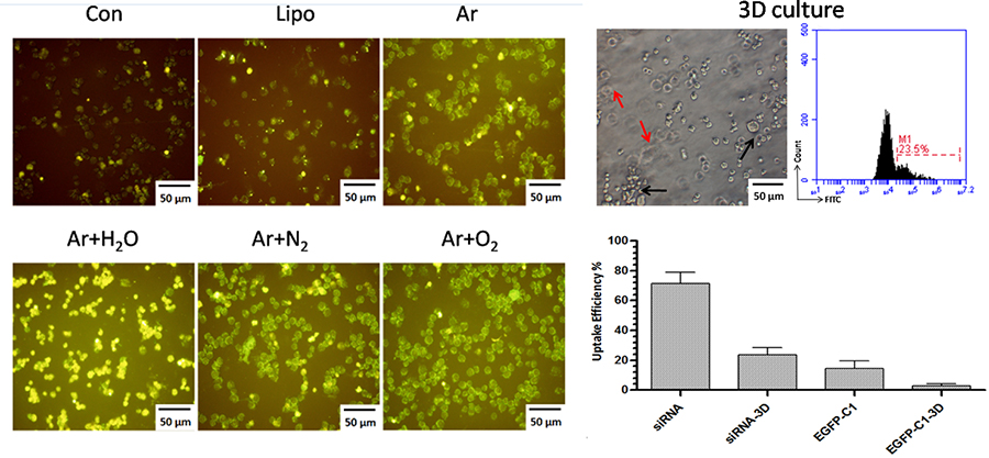 近日,许德晖等完成的论文“Intracellular ROS mediates gas plasma-facilitated cellular transfection in 2D and 3D cultures”在Scientific Reports在线发表。该论文通过系统对比等离子体转染法和生物上两种最常用的转染方法(脂质体转染法和电转染法),发现等离子体转染法具有转染效率高,细胞死亡率低等优势。同时,明确指出等离子体转染的机制是等离子体产生的多种活性氧粒子,使细胞内ROS升高并增加了细胞膜通透性,从而使得外源核酸物质更易进入细胞内。该论文还首次尝试用等离子体来转染3D培养细胞,显示出独特的转染应用前景。该成果也已申报国家发明专利,No.201410628429.5