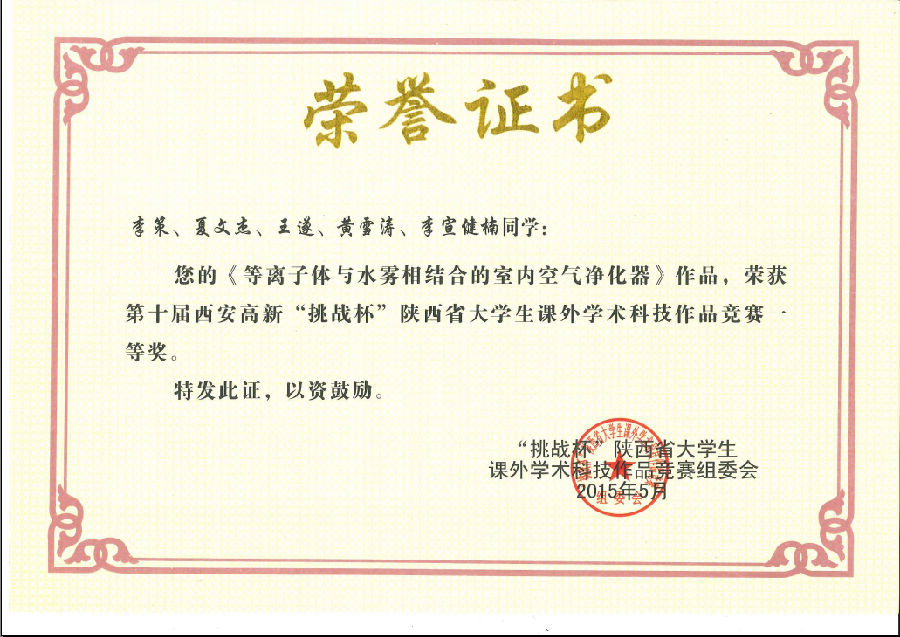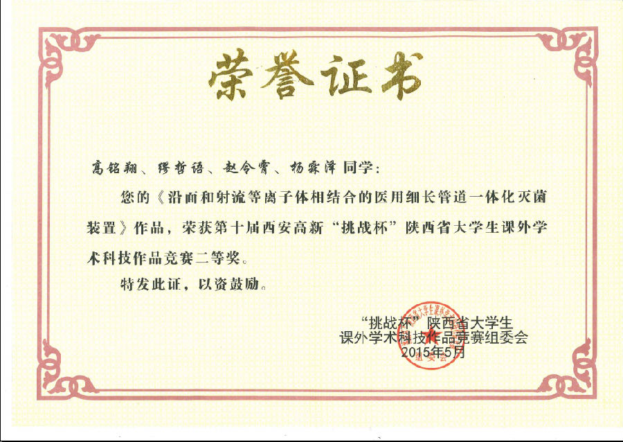 5月21日,第十届西安高新“挑战杯”陕西省大学生科技作品竞赛终审决赛在杨凌西北农林科技大学闭幕。在王小华老师和刘定新老师的共同指导下,李策、夏文杰、王遂、高铭翔等同学的作品《等离子体与水雾相结合的室内空气净化器》和《沿面和射流等离子体相结合的医用细长管道一体化灭菌装置》分别荣获一等奖和二等奖。
