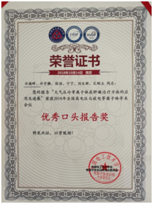 2018年全国高电压与放电等离子体学术会议于10月12-14日在江苏南京召开,大会共征集学术论文摘要460余篇,中英文全文近200篇,设有高电压、脉冲功率和等离子体基本过程及应用共7个口头报告分会场和近200个海报展示。中心刘定新教授作了题为“等离子体处理水溶液中活性粒子的产生机制研究”的特邀报告并担任“生物医学及农业食品”分会场的主持人。中心许德晖副教授、郭莉副教授、张浩博士后以及夏文杰和刘亦凡博士分别作了口头报告,许宇静技术员和宁宁硕士通过海报展示了各自研究成果。其中,许德晖副教授和许宇静技术员分别荣获了“优秀口头报告奖”和“优秀张贴海报奖”。
